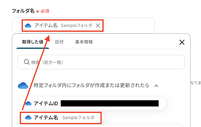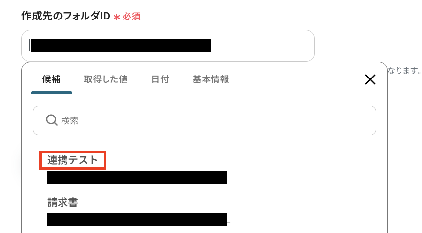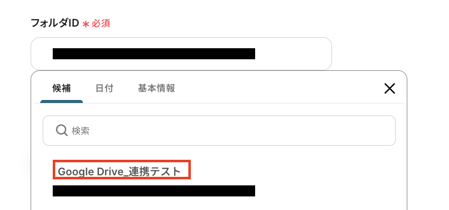 「フォルダID」も「ドライブID」と同様に、候補から選択してください。