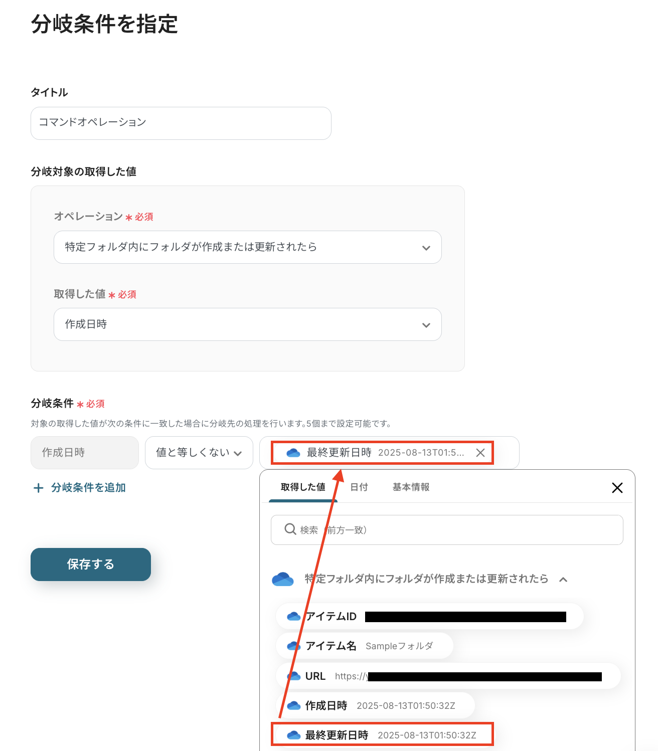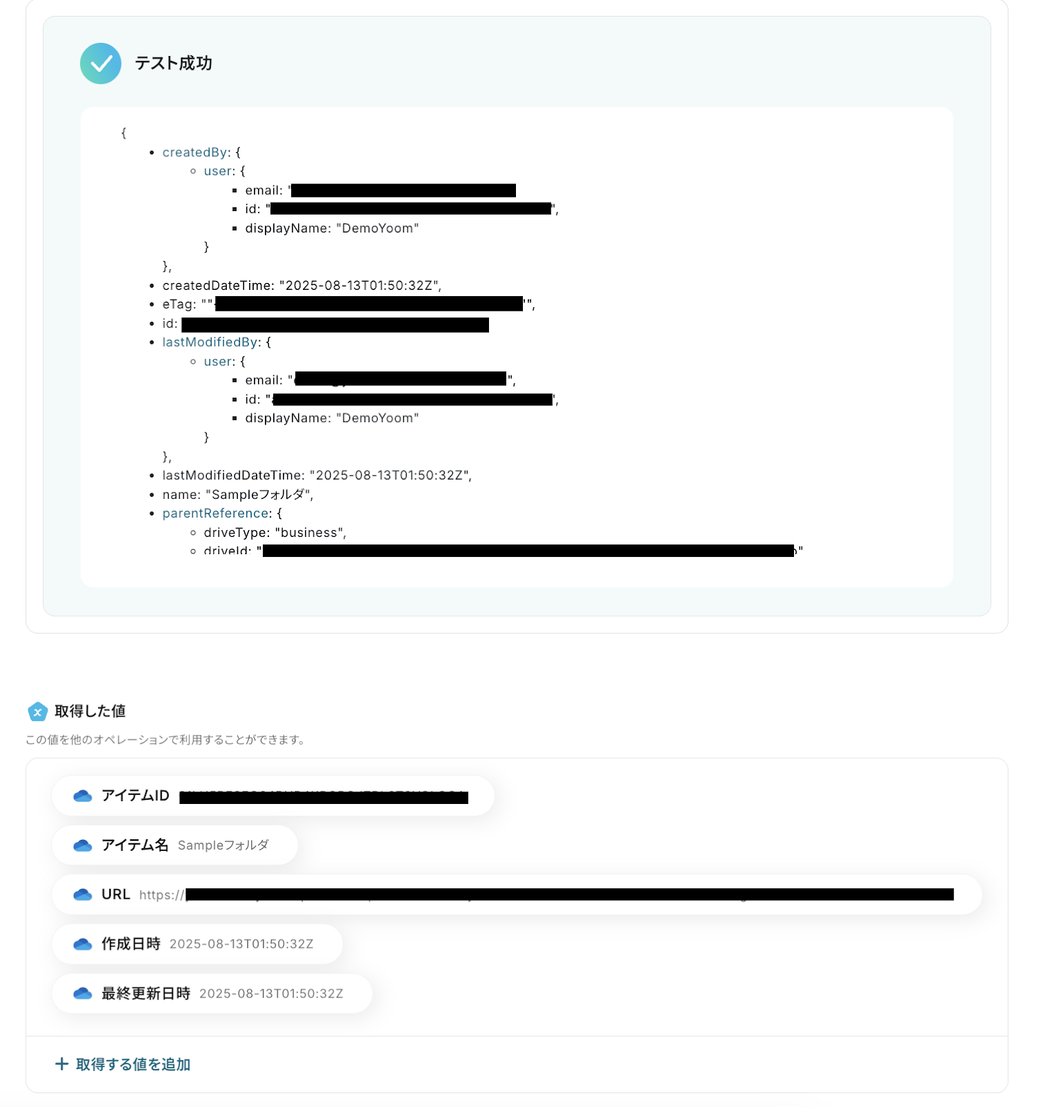 テストが成功すると、先ほど作成したフォルダの情報が「取得した値」にアウトプットとして抽出されるので、内容を確認しましょう。
