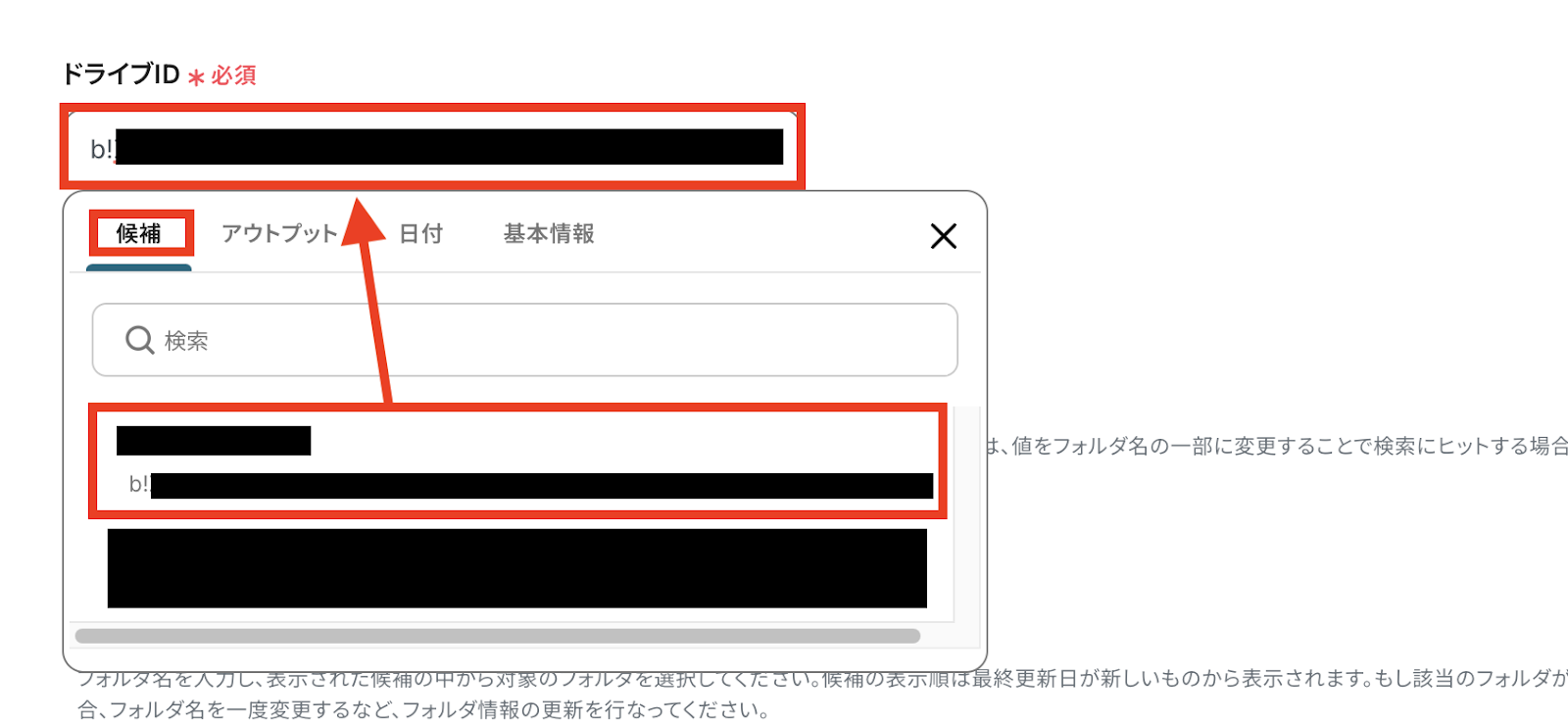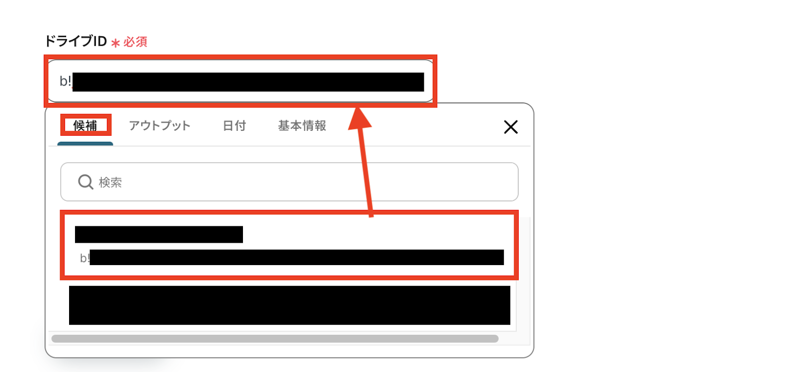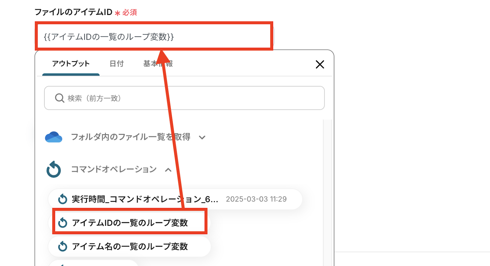 入力欄をクリックして、アウトプットを表示させます。ステップ5で取得した「アイテムIDの一覧のループ変数」を選択しましょう!