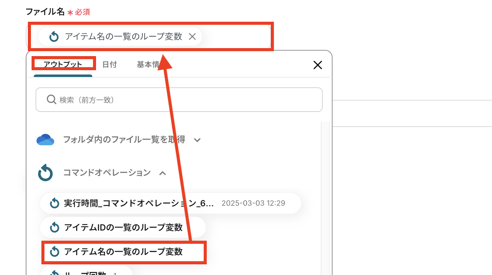アウトプットからステップ5で取得した「アイテム名の一覧のループ変数」を選びます。