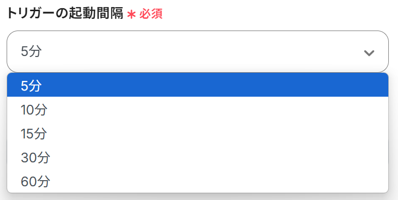 ・トリガーは5分、10分、15分、30分、60分の間隔で起動間隔を選択できます。プランによって最短の起動間隔が異なりますので、ご注意ください。