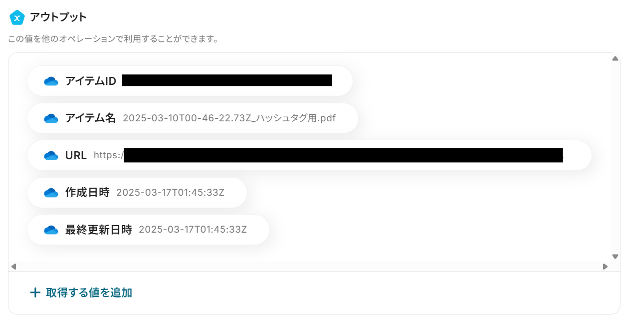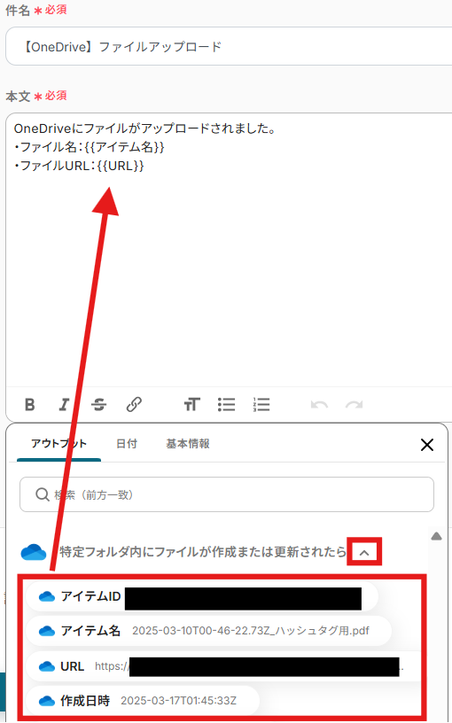 - 「本文」→OneDriveのアウトプットを活用して設定