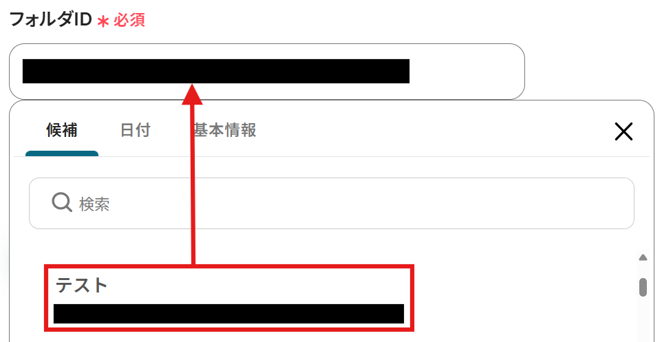 次に、「フォルダID」を候補から選択します。