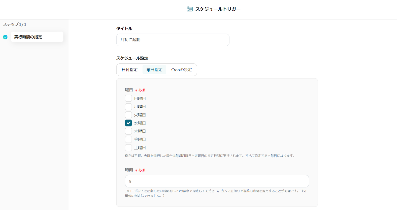 この場合は希望の曜日にチェックを入れ、時刻を記入することで設定できます。