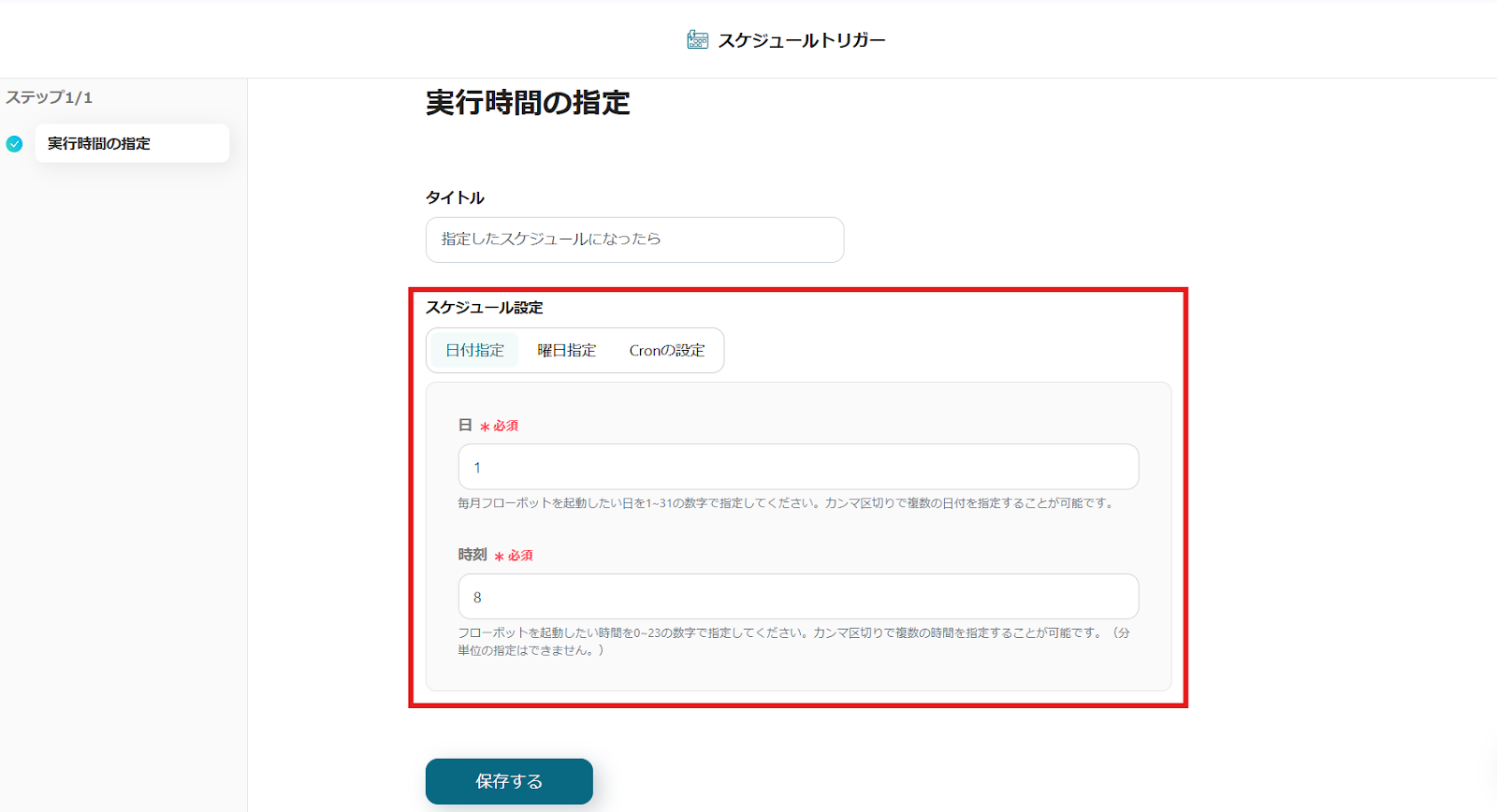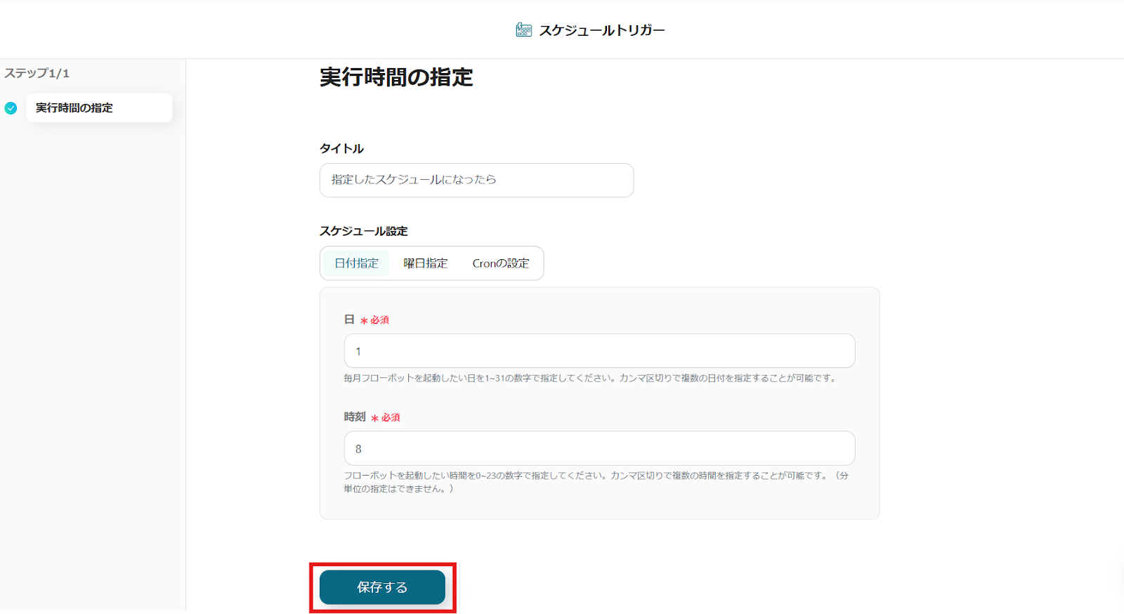 画像の設定では、毎月1日の朝8時にフローが起動する設定になっています。希望がある場合は数字を変更し、任意で修正しましょう。