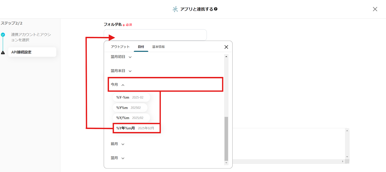 その下にあるフォルダ名に関しては、例としてフォルダ作成月をタイトルにしてみましょう。ボックスをクリックします。