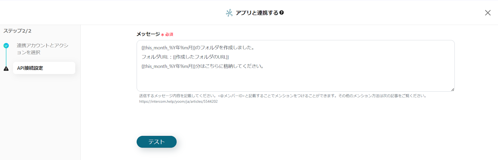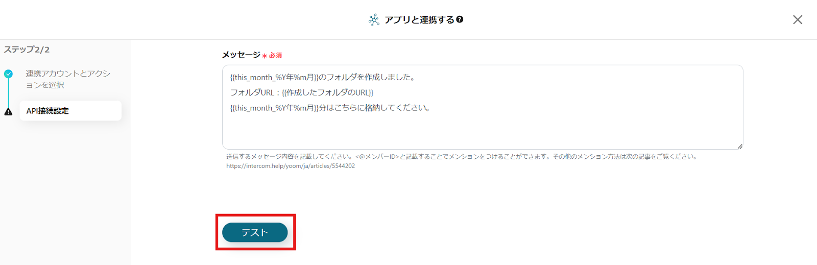 メッセージの設定ができたら、下部にあるテストボタンを押してください。