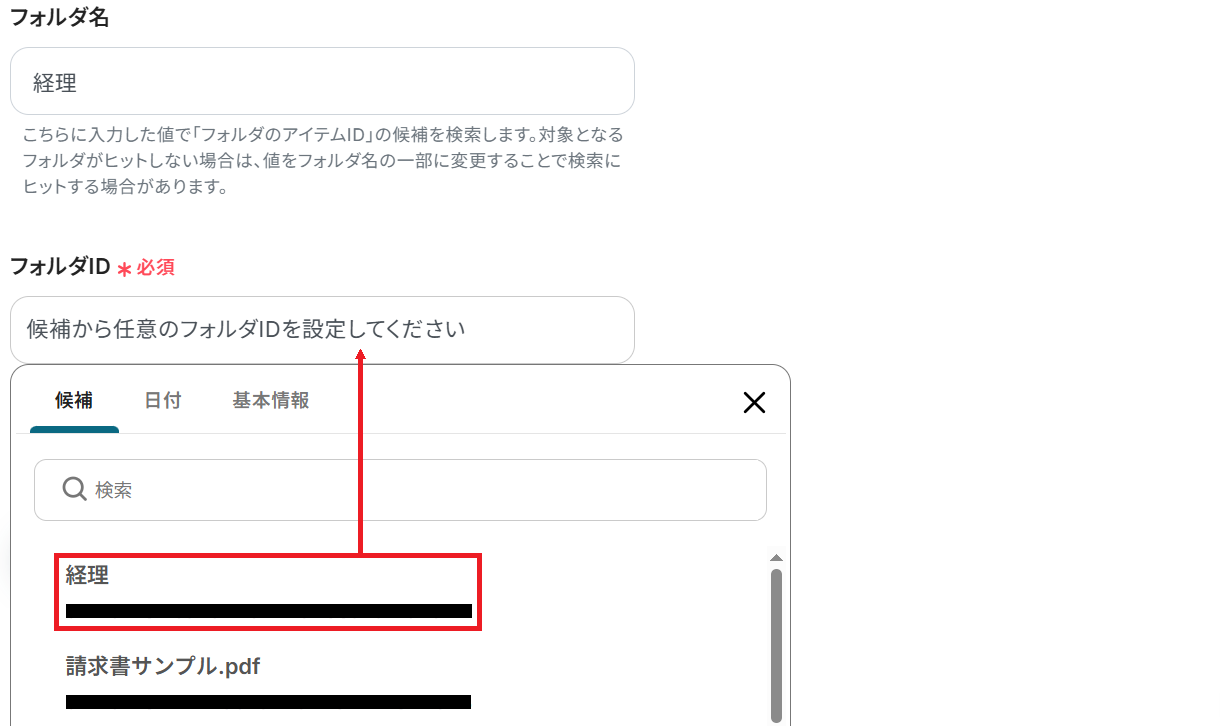 フォルダ名の欄に該当のキーワード(今回でいうと「経理」)を入力すると、フォルダIDの候補が絞られます。