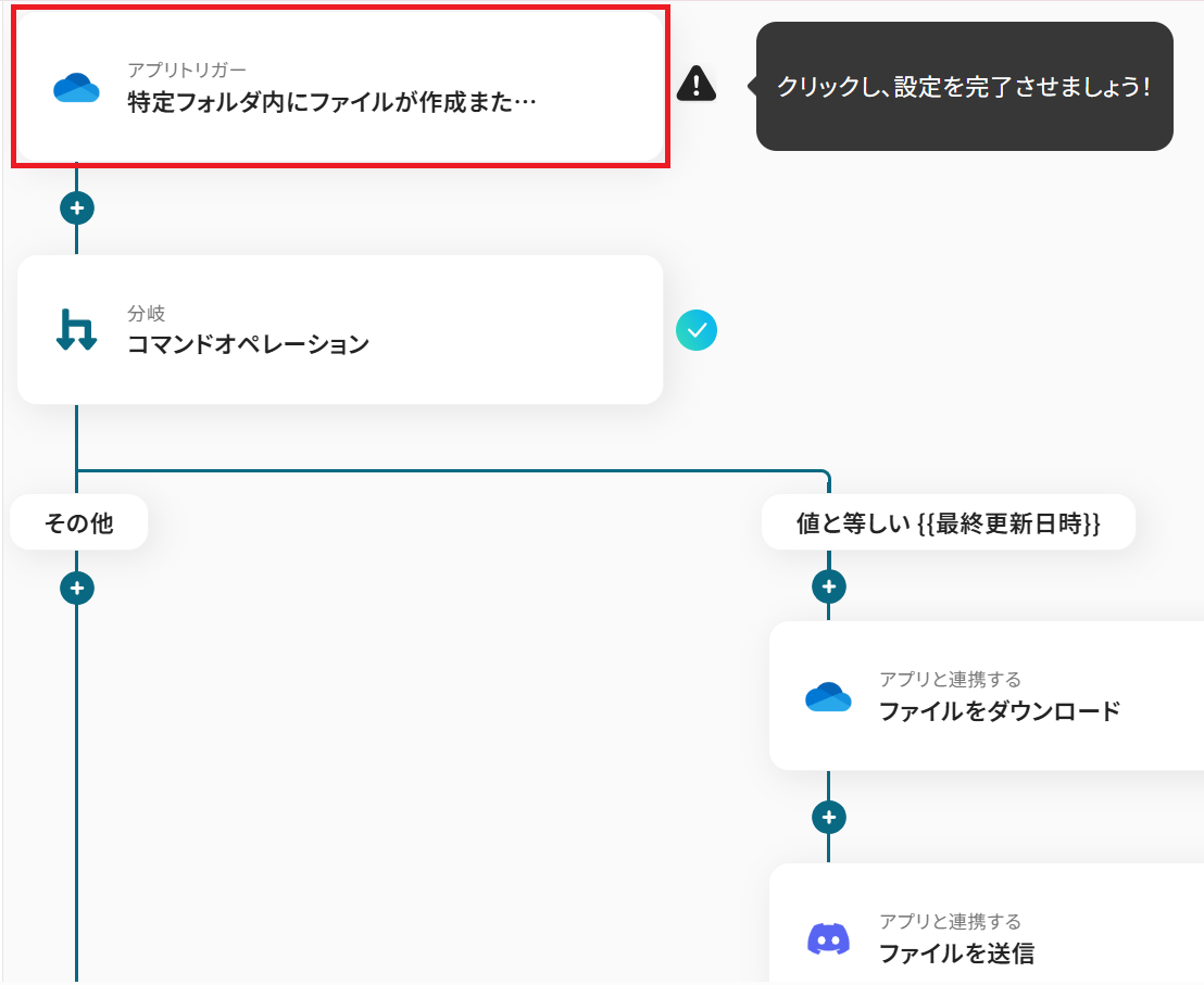 - OneDriveのトリガー設定、分岐設定、OneDriveのアクション設定、Discordのアクション設定