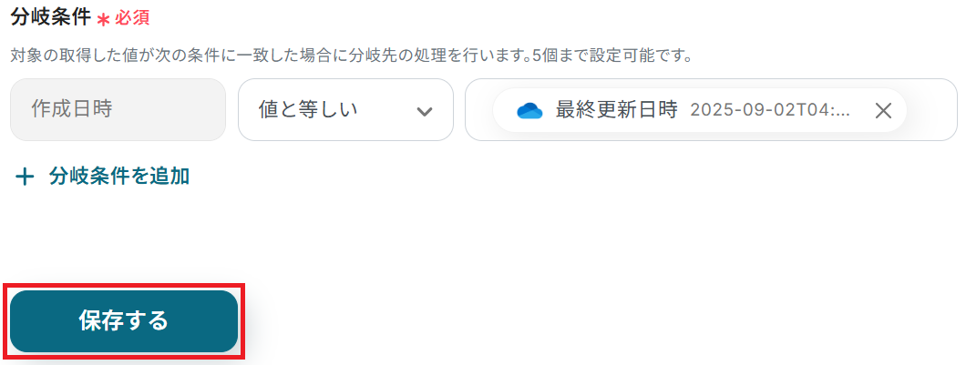 次に分岐条件を設定してください。今回は、取得した値(作成日時)が最終更新日時と等しい場合に次のステップに進むよう設定しています。