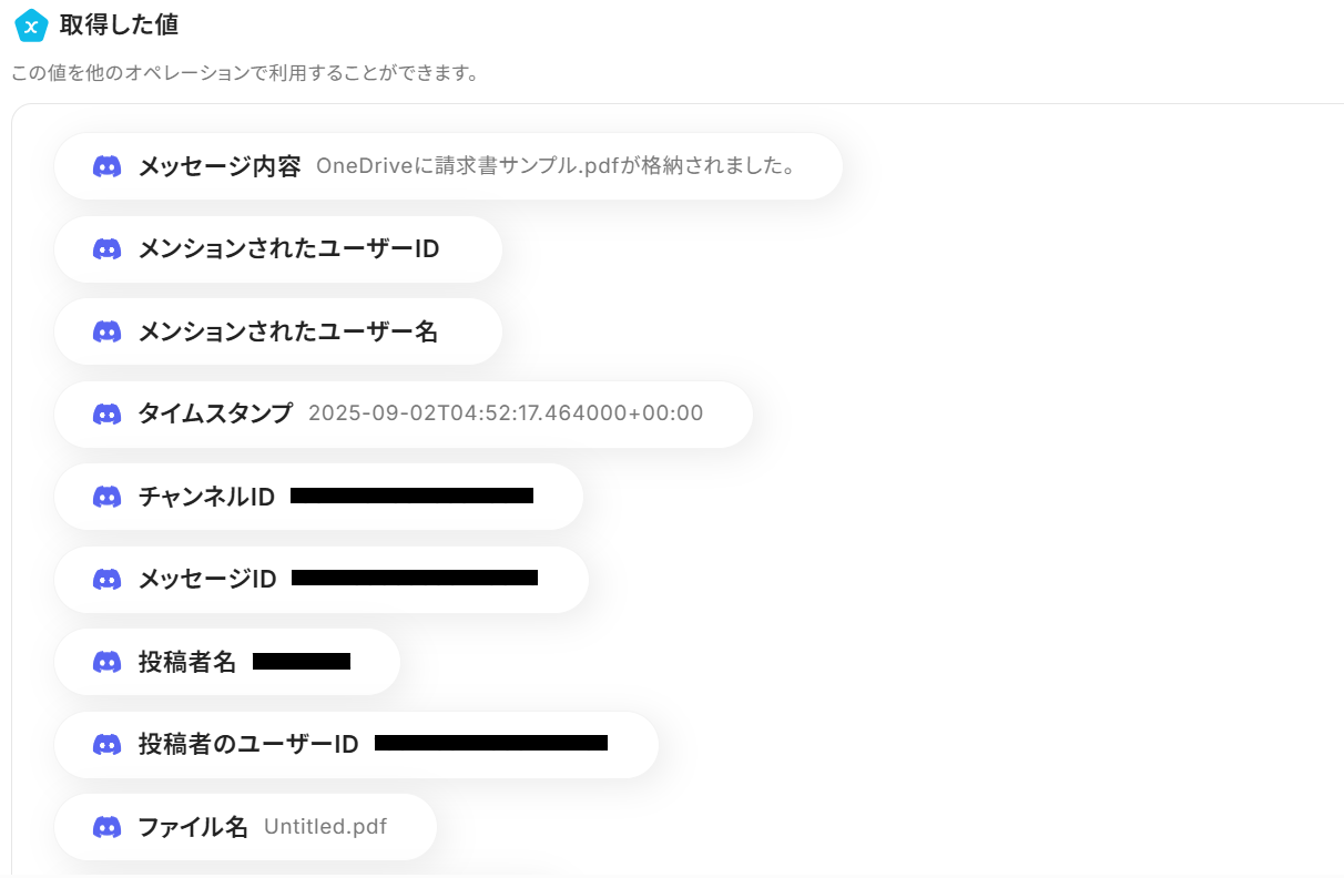 取得した値について、詳しくはこちらをご参照ください。なお、この取得した値はこの後の設定で活用でき、Discordに自動送信可能です!