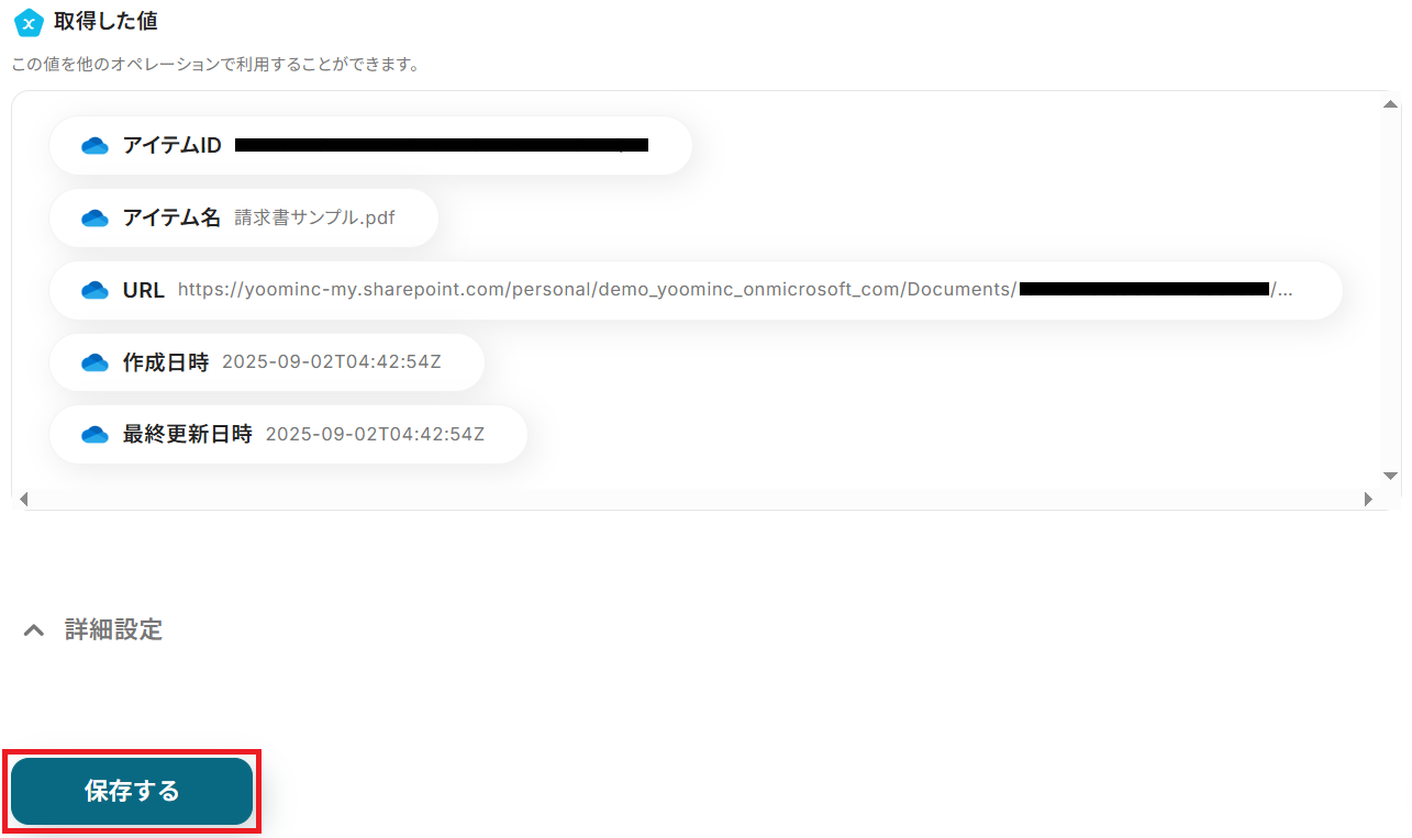 テストが成功すると、取得した値が表示され、OneDriveのデータが確認できます。「保存する」をクリックして完了です!