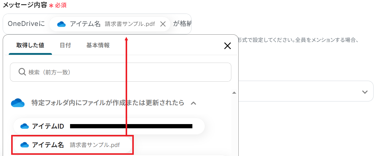 OneDriveから取得した値は変数となるため、フローが起動する度に最新のデータとなります。なお、取得した値を活用せず直接入力したテキストは固定値となるため、組み合わせて自由にカスタマイズできます。通知したい形式で設定してみましょう。