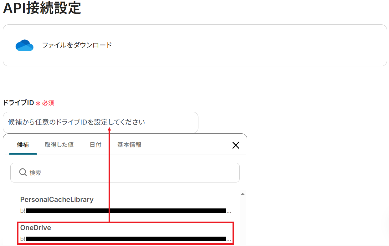 API接続設定画面に移るので、ドライブIDを候補から選択しましょう。