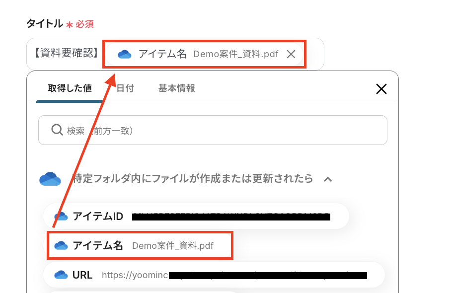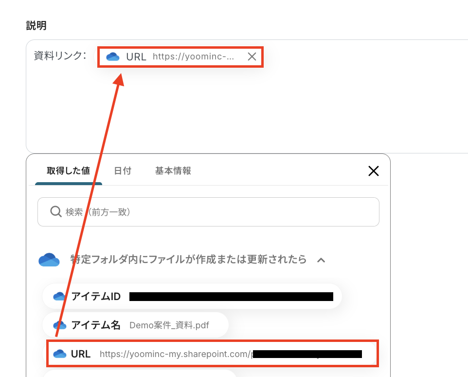 ・ドライブID/サイトID:OneDriveの場合はドライブID、SharePointの場合はサイトIDを選択します。
