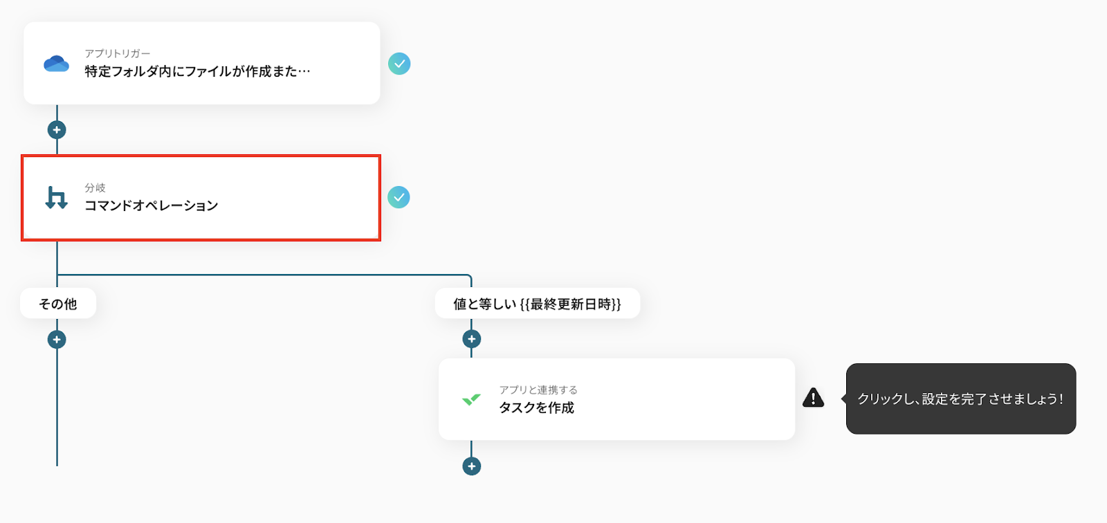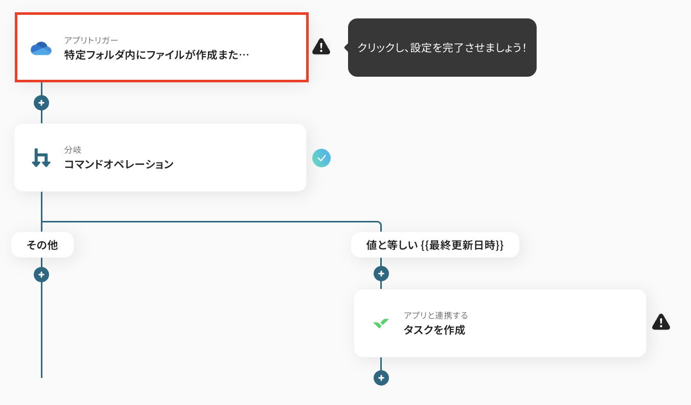 この分岐条件の設定を入れることで、OneDrive内のファイルが「更新」された際はタスクを作成せず、新たにファイルが「作成」された場合にのみWrikeにタスクを作成することができるようになります。
