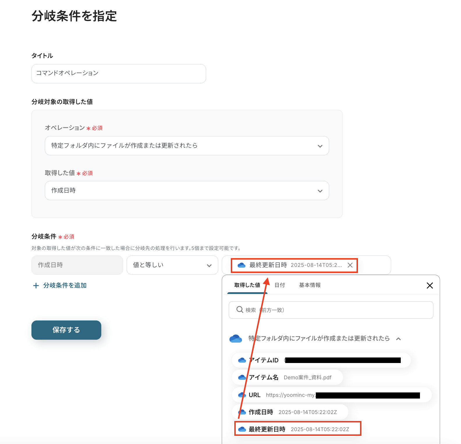 ステップ3でOneDriveから取得した値のうち、「作成日時」と「最終更新日時」の値が同一であることを、後続のアクションへ繋げる条件として設定されていますよ!