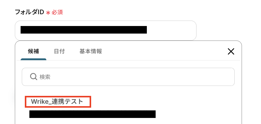 「フォルダID」も「ドライブID」と同じように、候補から選択してください。