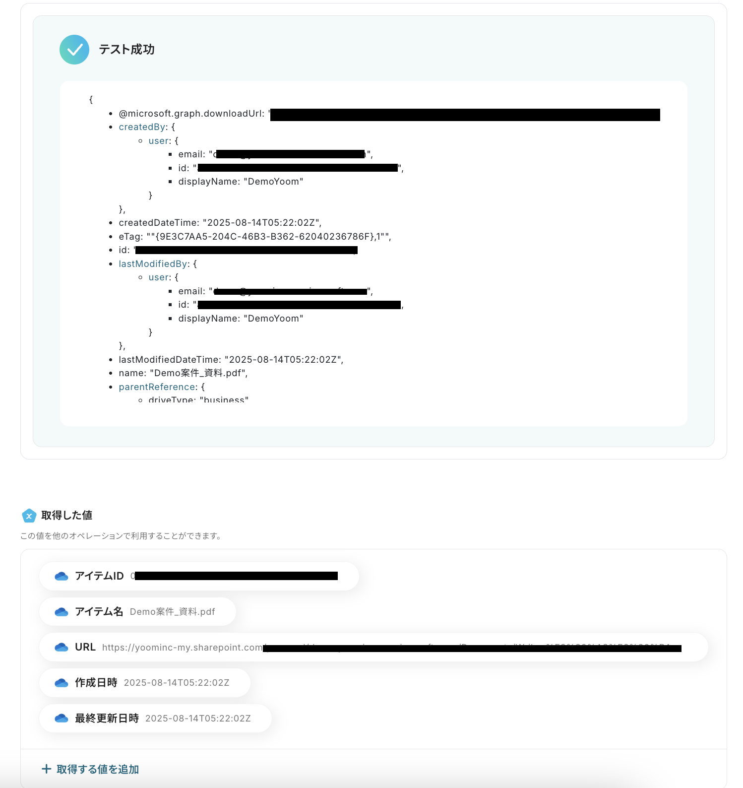 テストが成功すると、先ほどアップロードしたファイル情報が「取得した値」が抽出されるので、内容を確認しましょう。