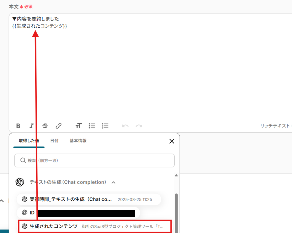 「本文」には取得した値を使用してOpenAIの生成されたコンテンツを入力しました。