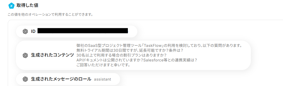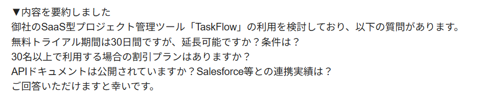 このようにアウトプットを活用することで、フォームから問い合わせなどが送信される度に自動要約可能となります。