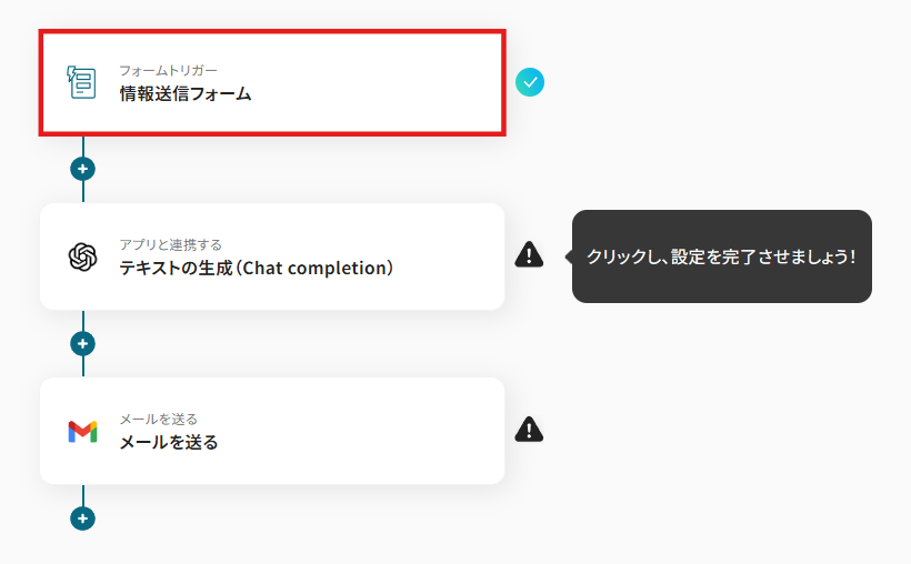 そこでこの連携を活用すれば、「緊急」「クレーム」といった特定のキーワードを含む問い合わせがフォームで受信された場合にのみ、OpenAIによる要約とGmailでの通知を実行させることが可能です。