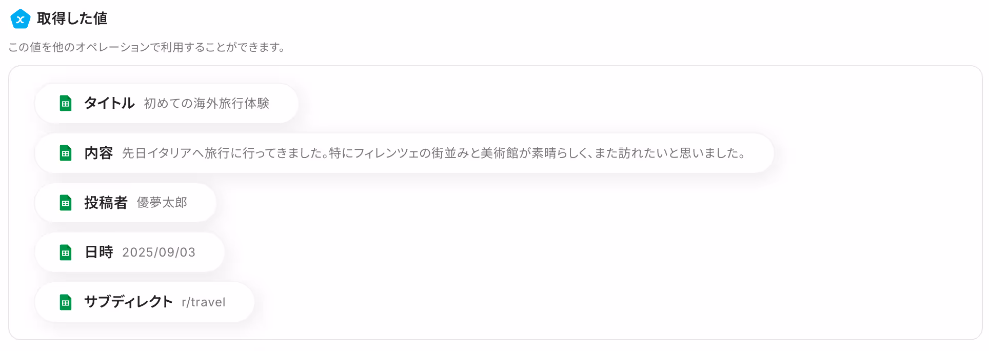 取得した値について、詳しくはこちらをご参照ください。なお、この取得した値はこの後の設定で活用でき、Google スプレッドシートに自動登録可能です!