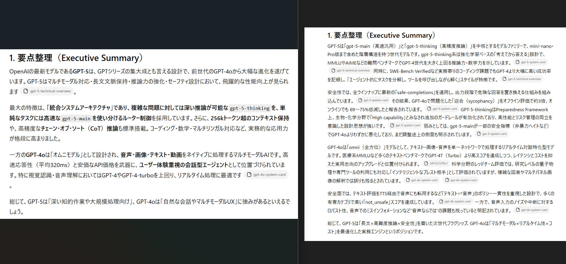 要点整理について、左がGPT-4o、右がGPT-5の結果です。GPT-4oは文字の装飾や改行が多く、パッと読んでも理解しやすい印象。専門知識がなくても「ざっくりとした違い」がつかめるなと感じました。