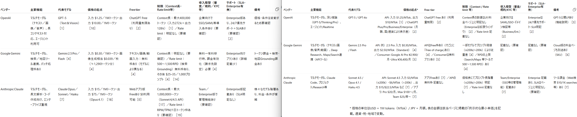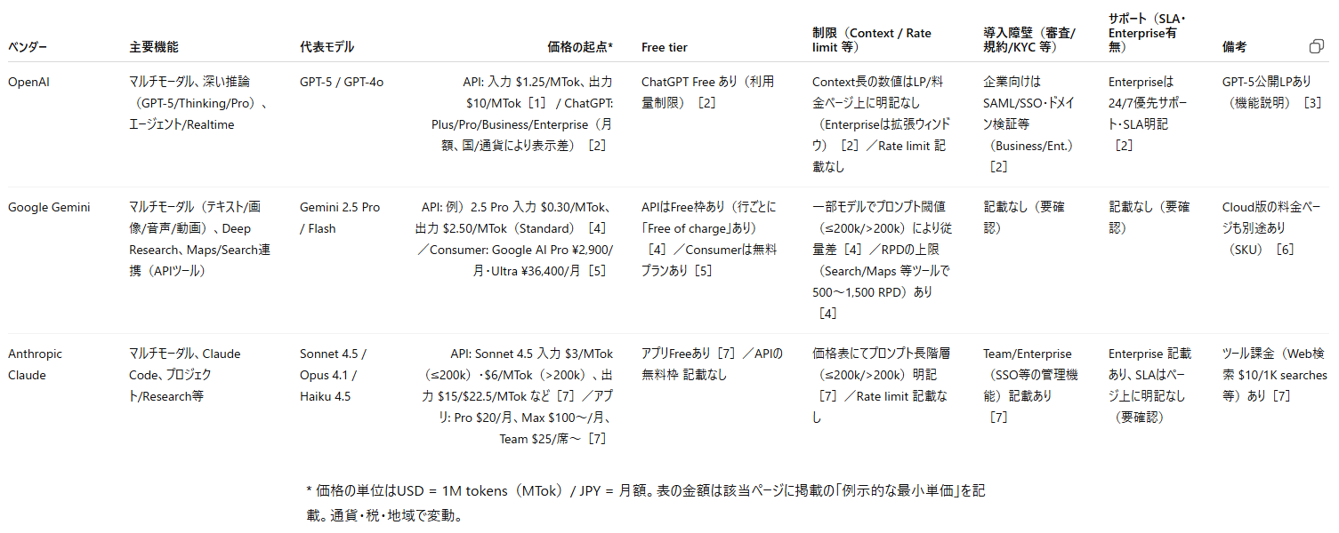 行:主要機能、代表モデル、価格の起点、無料枠、制限(コンテキスト長・Rate limit 等)、導入障壁(審査/規約/KYC 等)、サポート(SLA・Enterprise有無)、備考(但し書き・注意点)。