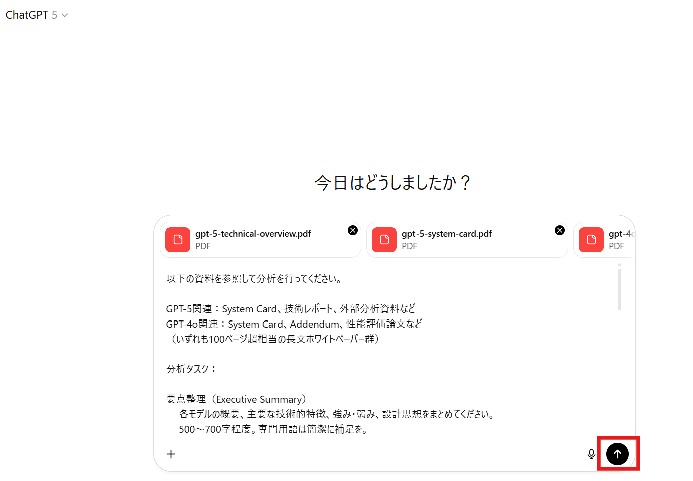 GPT-5とGPT-4oの100ページ超相当の長文ホワイトペーパー群を読み込ませ、要点、GPT-5とGPT-4oの機能比較、そしてマーケティング業務での使い分けの具体例をまとめたレポートを作成する。
