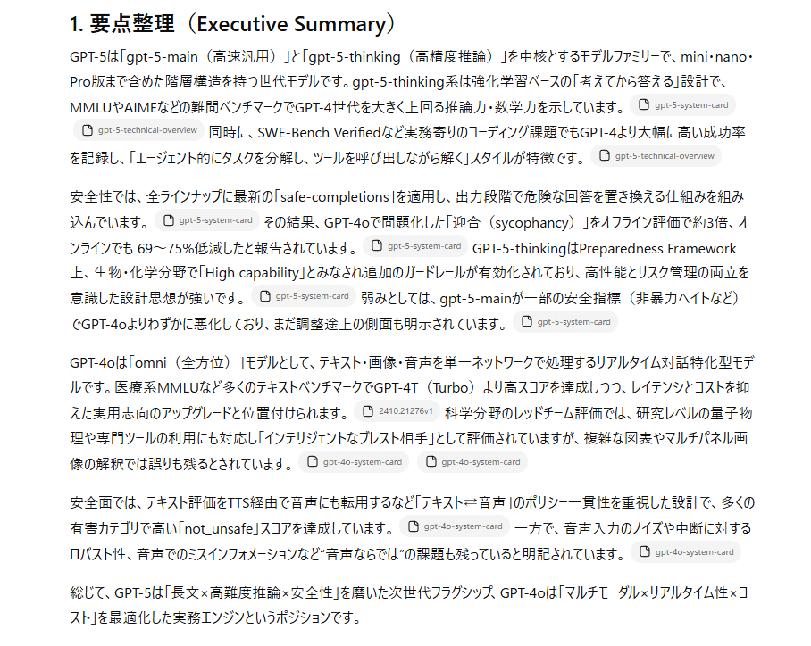 一方でGPT-5は深く正確な要約である一方、文字の装飾や改行もあまりないため読みにくいです。内容もより専門的なものとなっています。そのため、とりあえず概要をつかみたい方にはGPT-4oのほうが向いていると感じます!