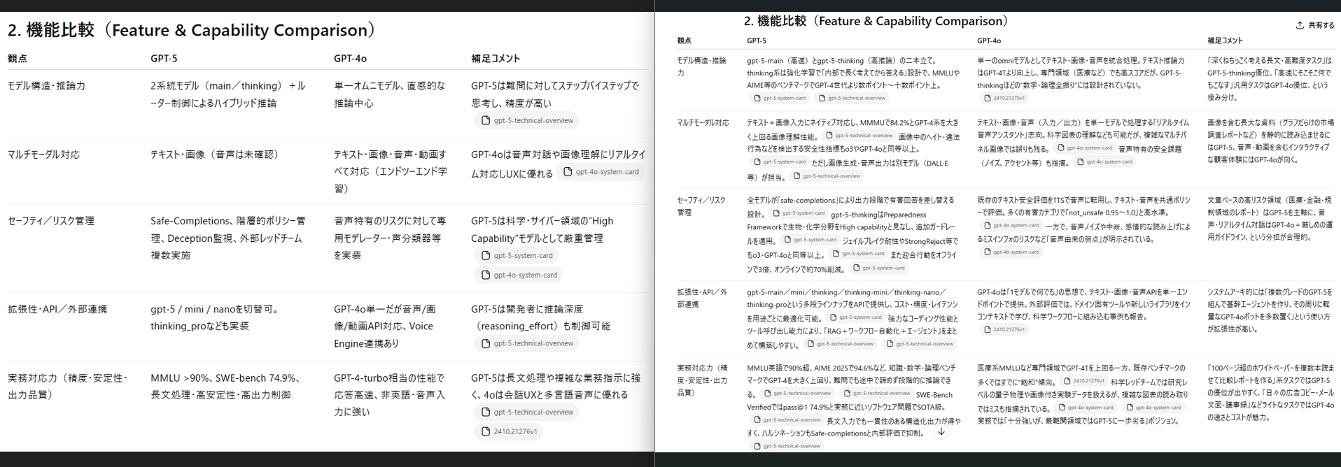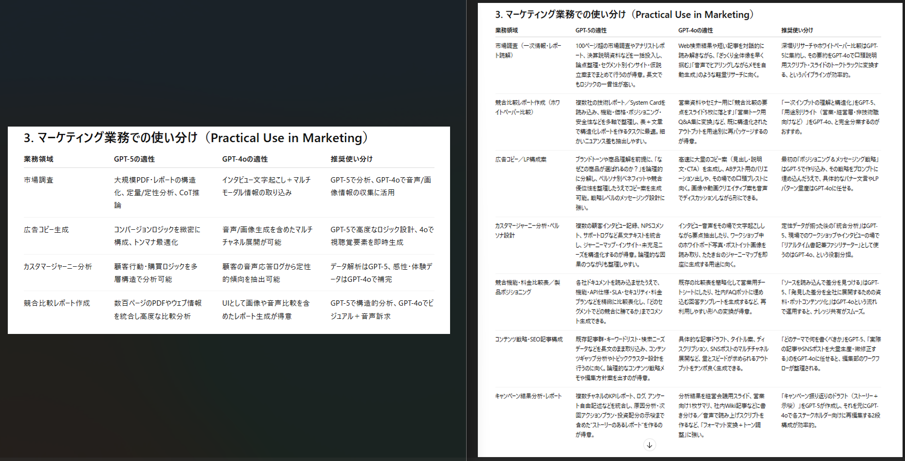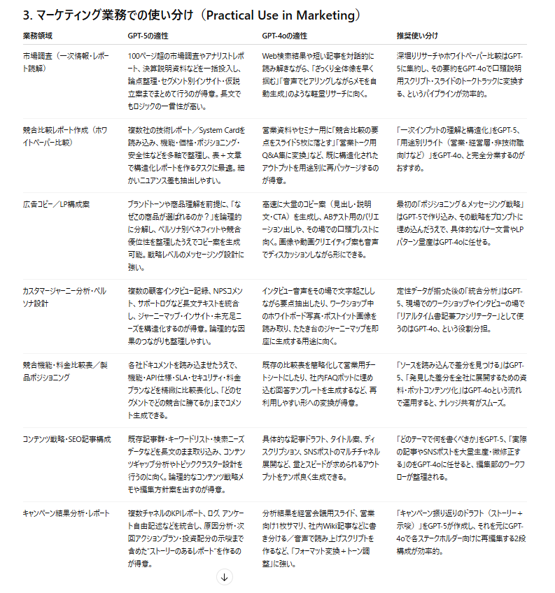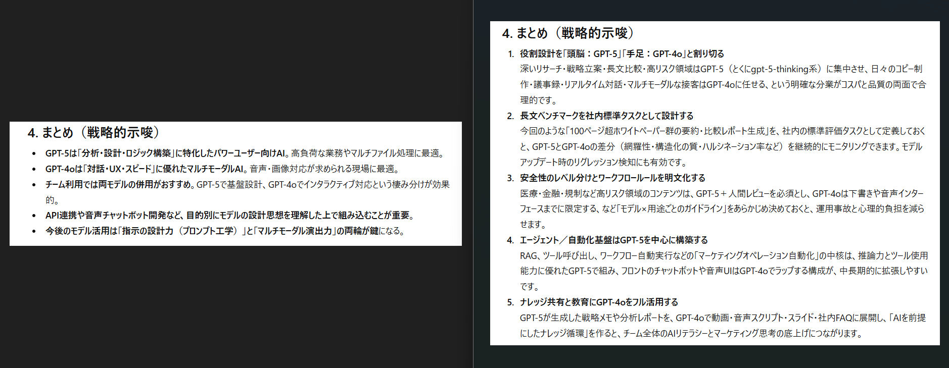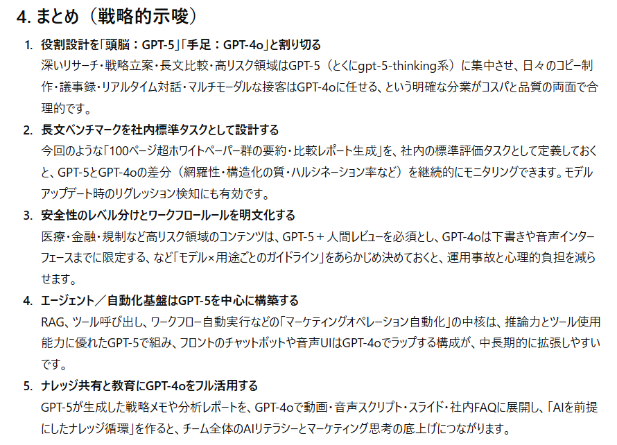 一方GPT-5は比較だけでなく活用戦略まで踏み込んだ記述が多く、業務フローの中でどう使い分けるべきかが明確に整理されています。