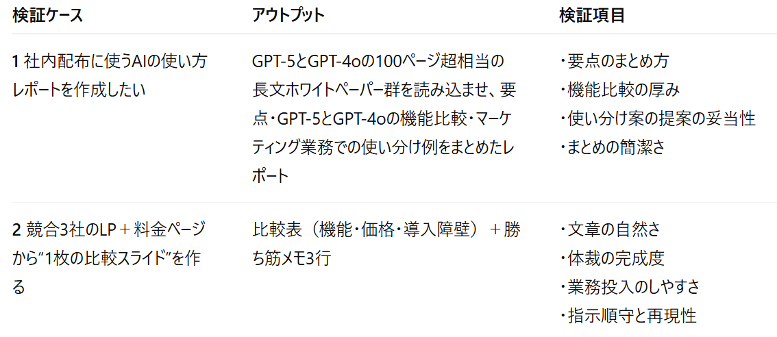 結果として、GPT-4oは読みやすく伝わりやすい一方で、導入判断において裏付けが不足する懸念があるかもしれません。また、GPT-5の出力の方がプロンプトの目的に対して適合性が高いと判断しました。