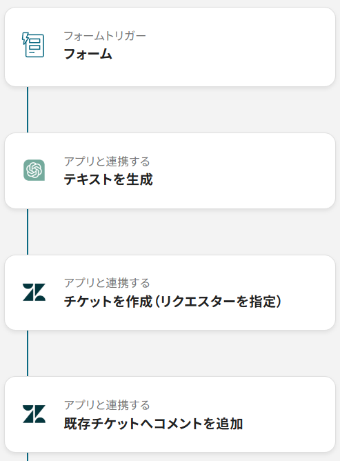 フォームで問い合わせが送信されたら、GPT-5で要約と一次回答案を生成し、Zendeskにチケットを作成するフローです。