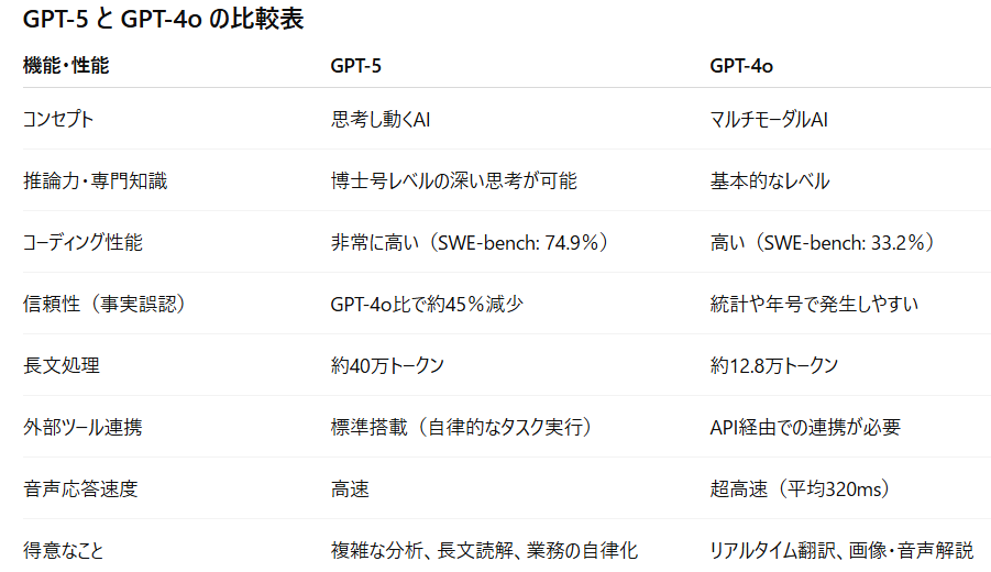 とはいえ、あらゆる場面でGPT-5が勝るわけではありません。スピードと軽快さではGPT-4oに軍配が上がる場面も多くあります。