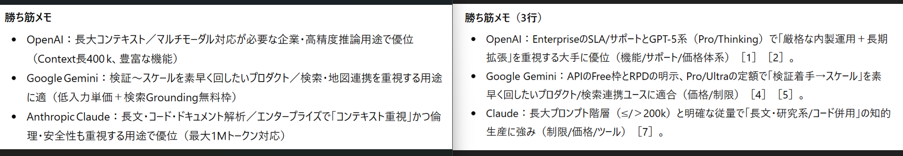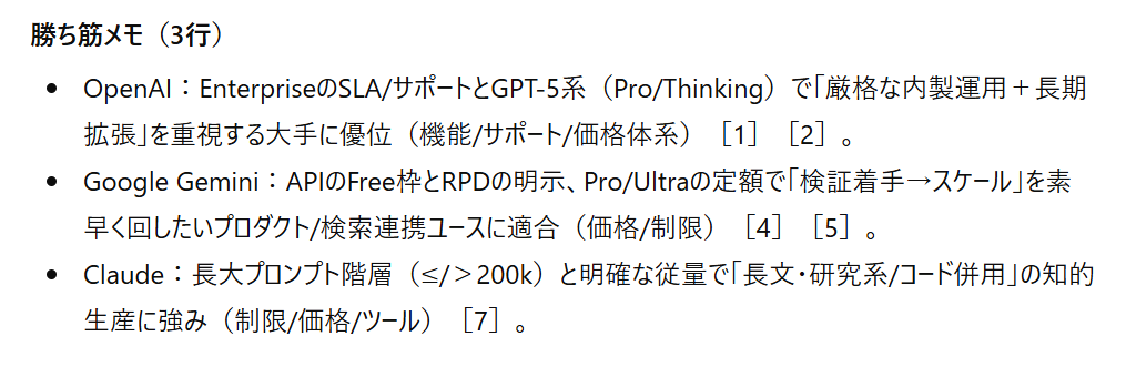 一方でGPT-5は、「機能/制限/価格体系」といった表内の該当行を脚注つきで明示しています。これはプロンプトの「勝ち筋メモには根拠を対応づけること」という指示に準拠しているため、読み手が「なぜその結論になるのか」を自力でたどれる構造になっています。
