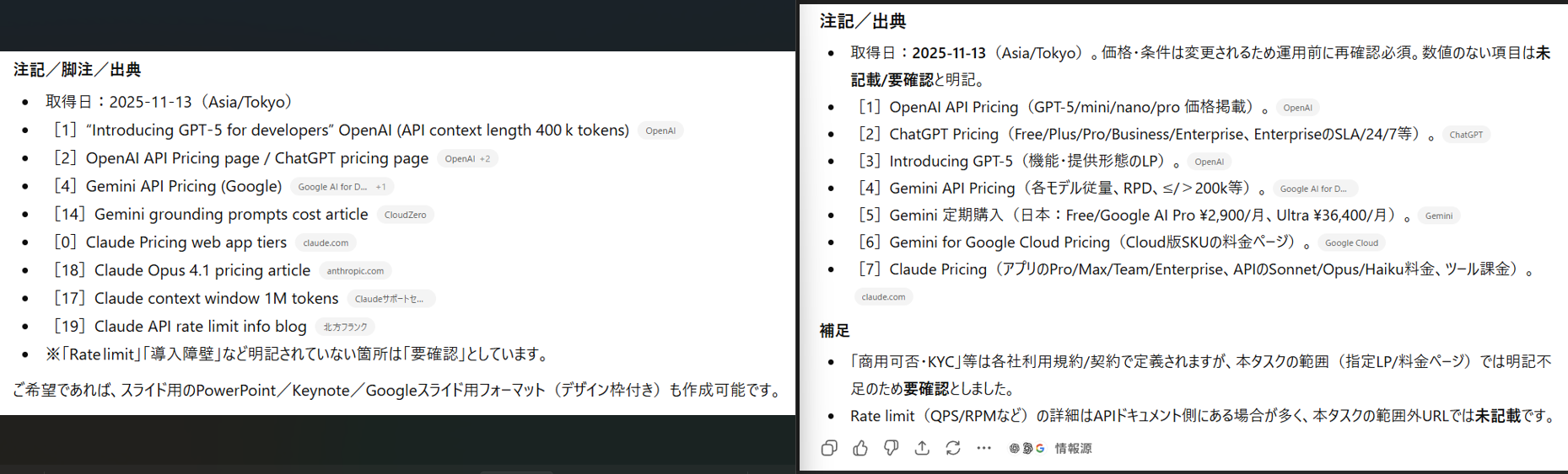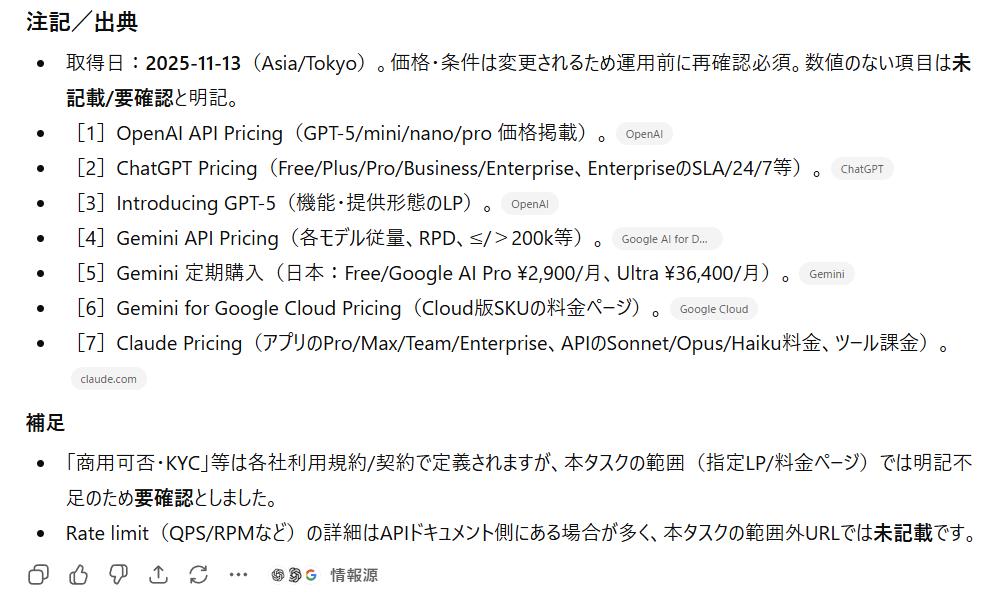 一方でGPT-5は、脚注ごとにどの種別の出典かを明記し、補足欄では限定条件もしっかり示してくれています。導入時に参照元を照合・監査する用途でも実用性が高いと判断しました。