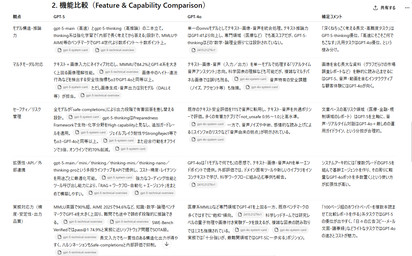 個人的に、GPT-5が単なる比較にとどまらず、活用戦略の設計まで踏み込んでいる点から、よりビジネス現場で再現性のある出力だと感じました。