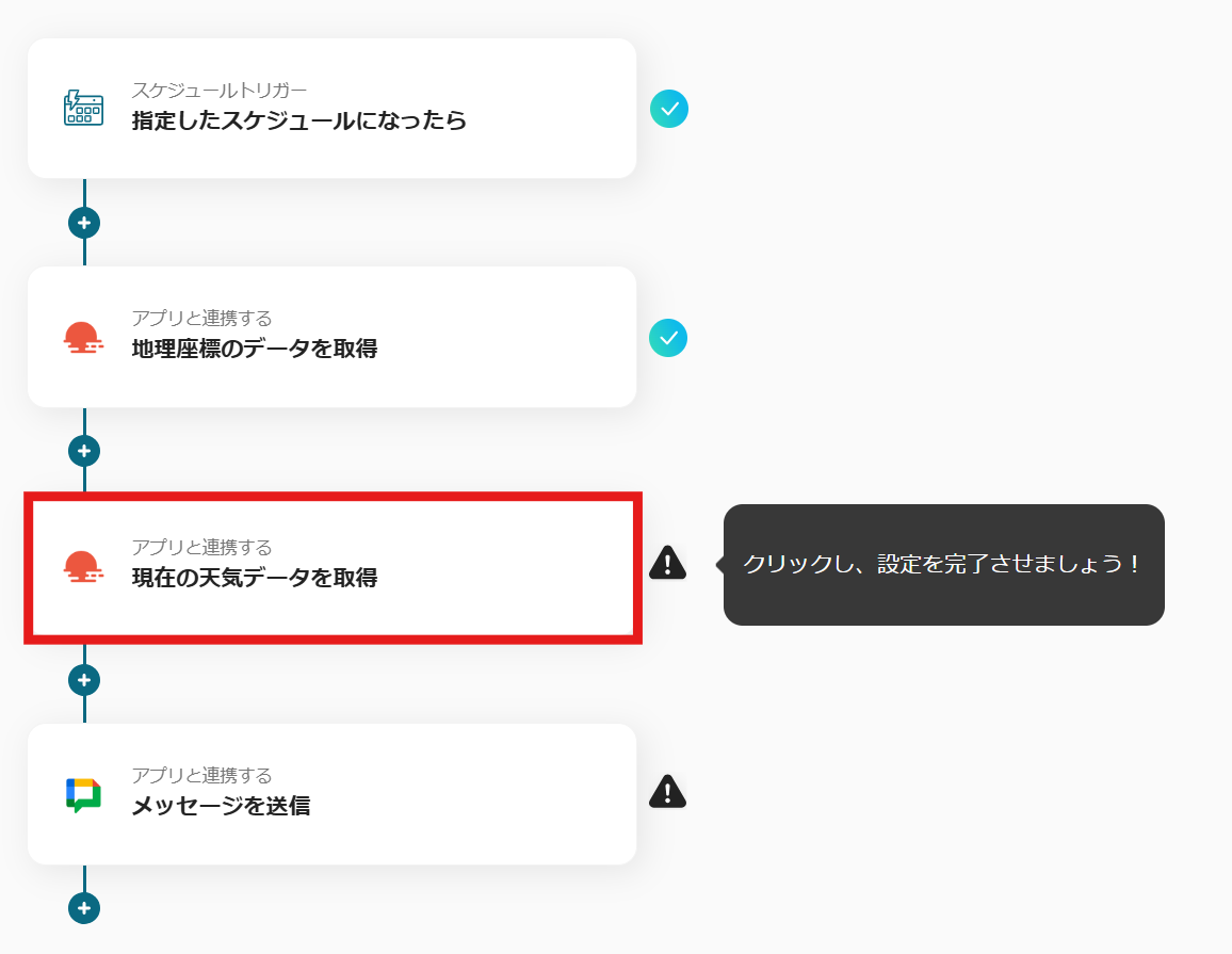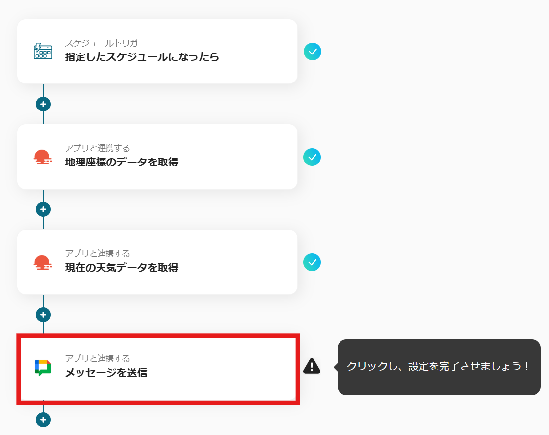 自動化を活用することで、OpenWeatherMapから取得した最新の天気予報が、Google Chatを通じて迅速に確認できるようになります。