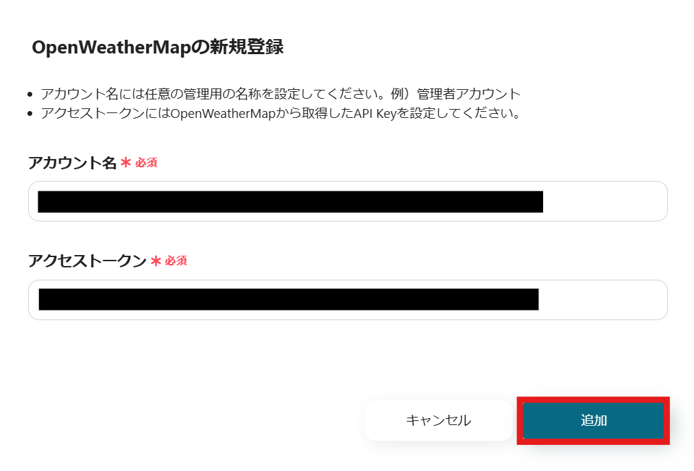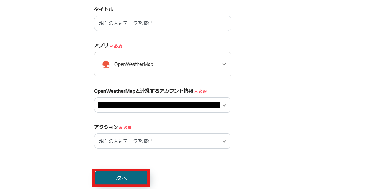 OpenWeatherMapと連携するアカウント情報を入力します。