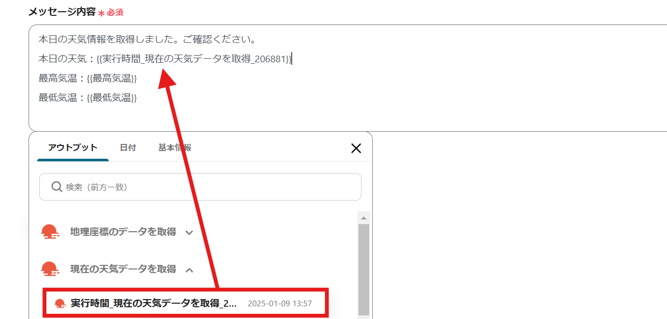 スペースのリソース名は入力欄をクリックすると候補が表示されるので、その中から選択してください。メッセージ内容は編集欄をクリックすると、「現在の天気データを取得」で取得した情報から引用してメッセージを作成できるので、適宜活用してください。
