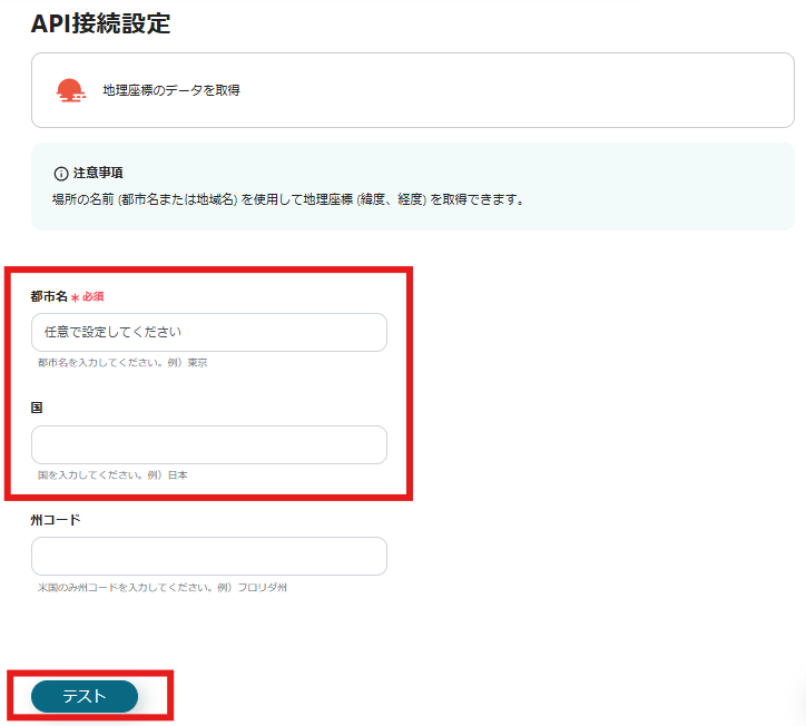 天気情報を受け取りたい「都市名」と「国」を入力し、