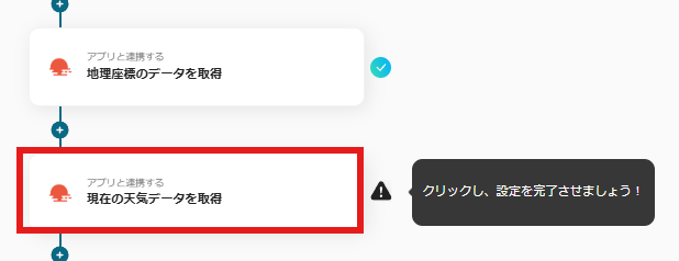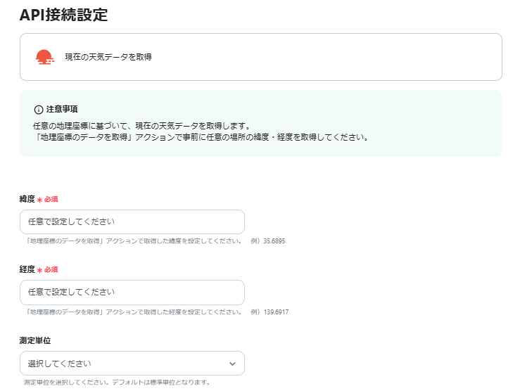 以下の画面のように「地理座標のデータを取得」をクリックすると、連携したOpenWeatherMapから取得したデータを入力することができます。
