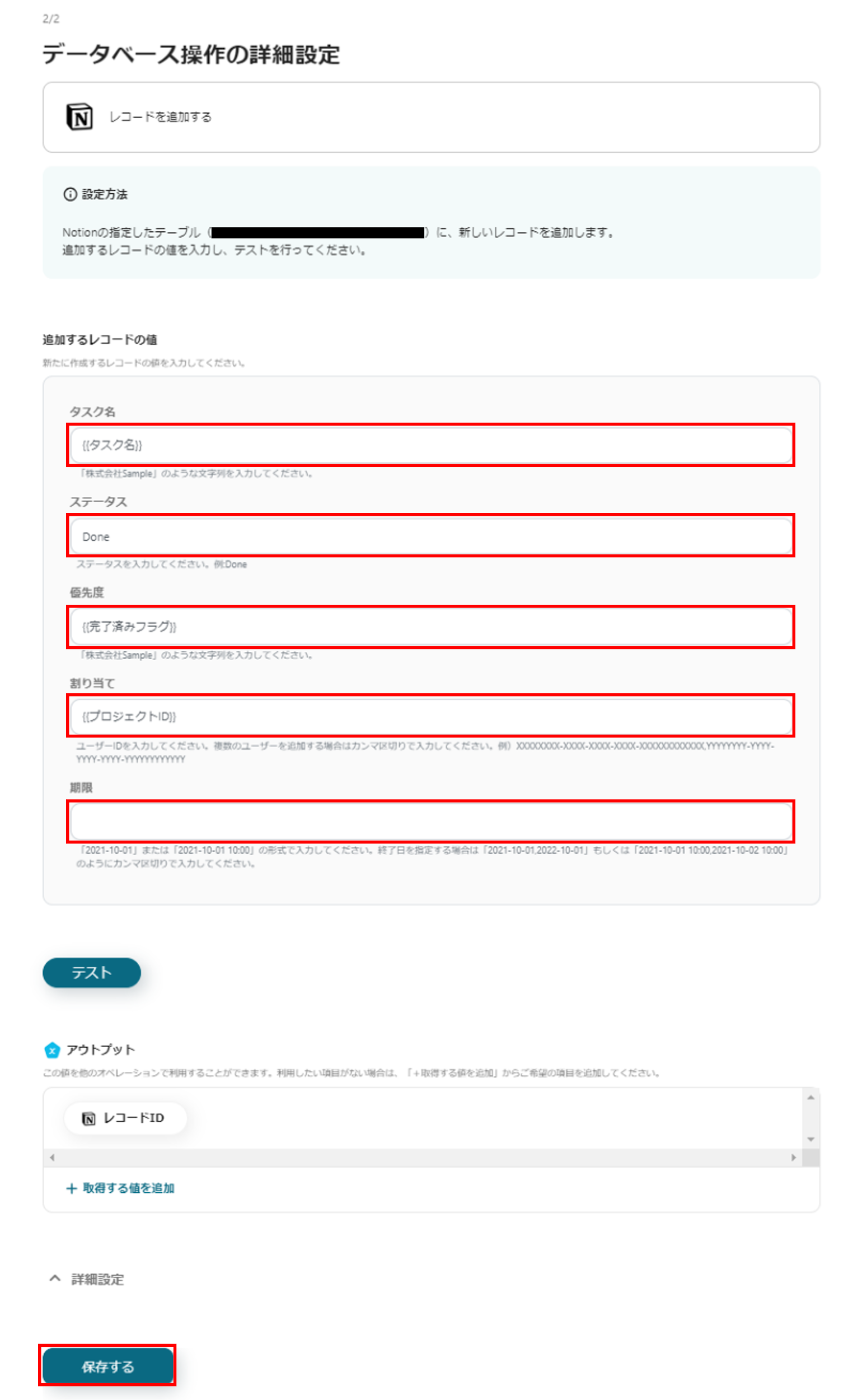 赤枠の設定が完了し、「テスト」をクリックしてエラーが出なければ「保存する」をクリックしましょう。
