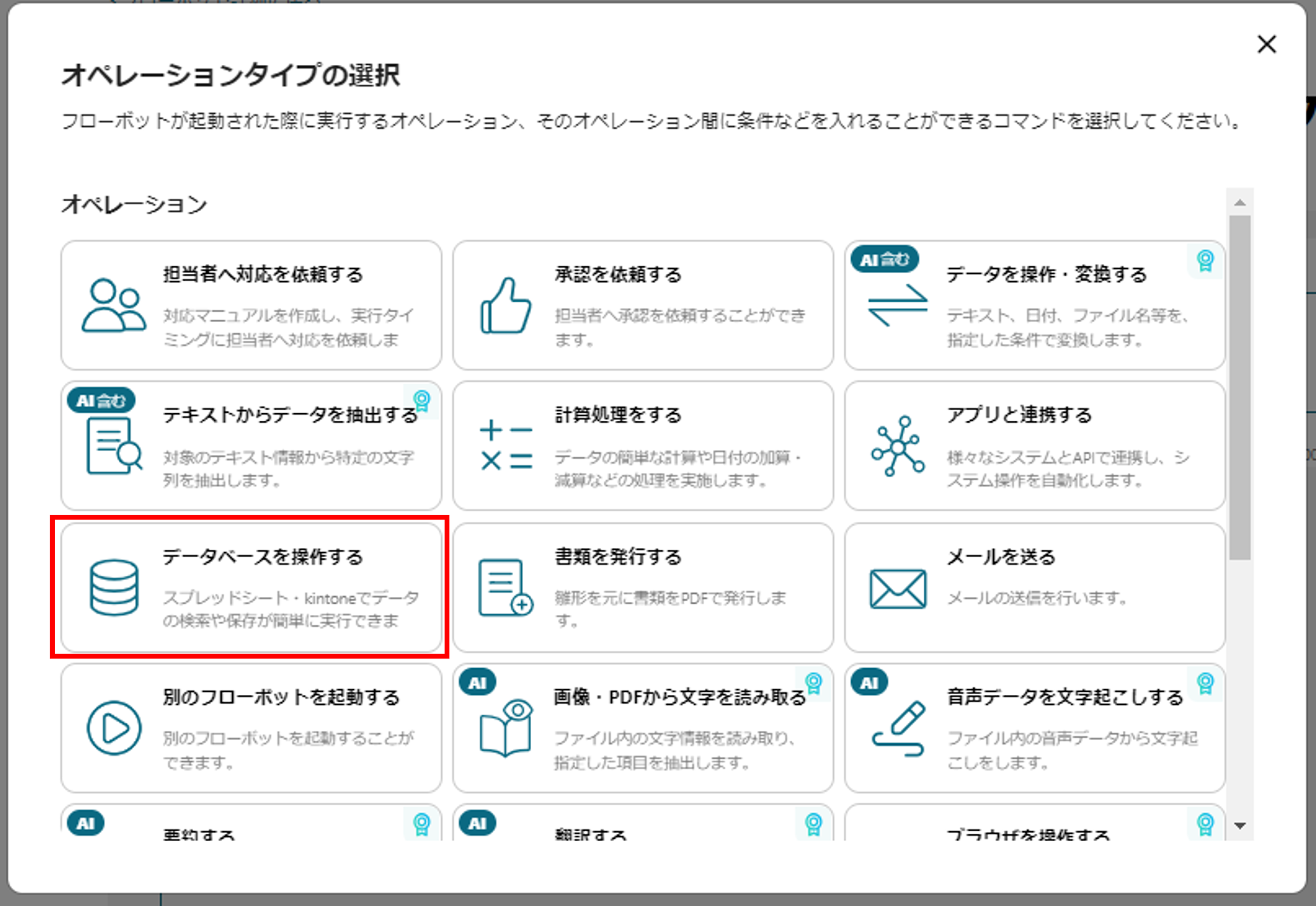 オペレーションの中から「データベースを操作する」を選択しましょう。