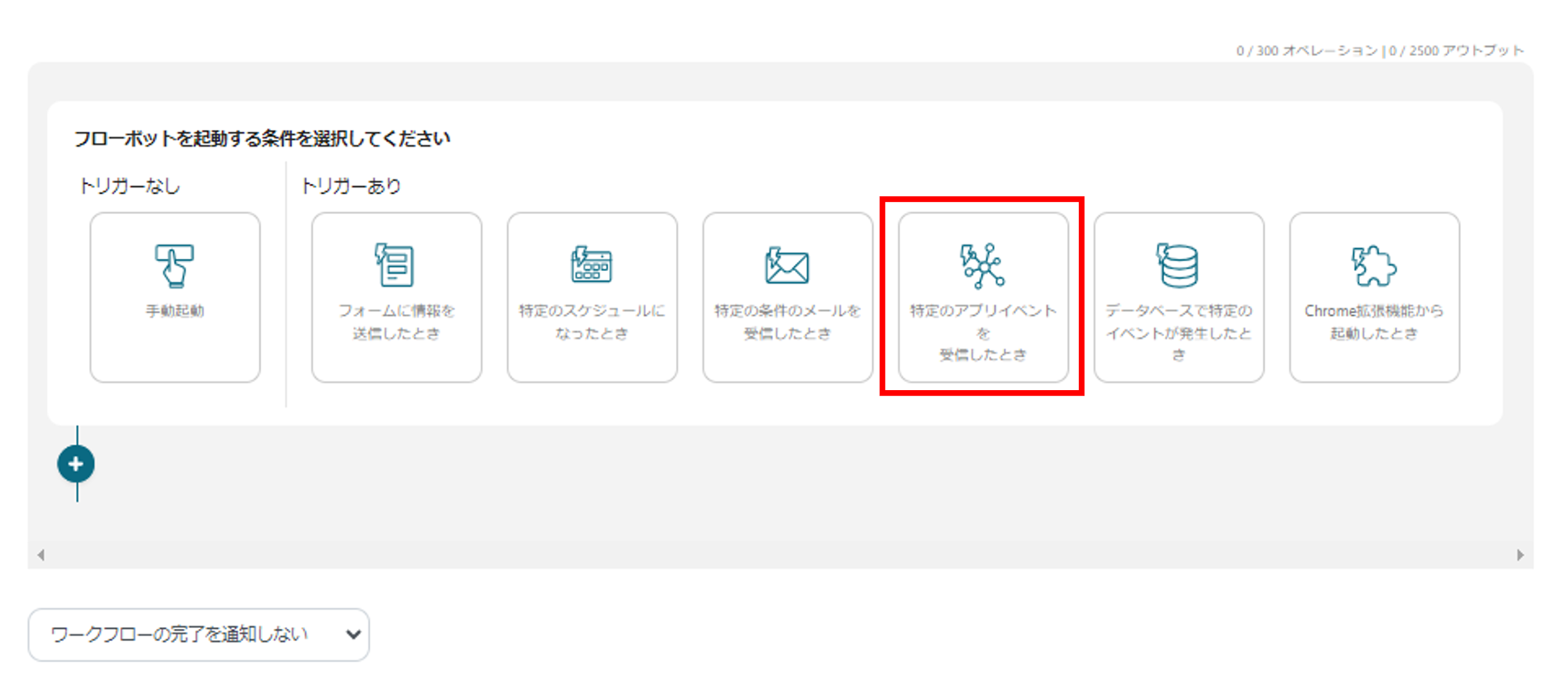 次のような画面に切り替わるので、アプリトリガー下に表示される「+」をクリックしてください。