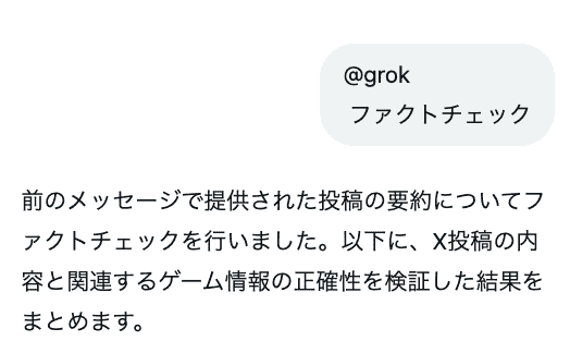 気になるニュースや投稿に対して、「@grok ファクトチェック」と入力するだけで、Web上の公開情報を横断的に分析し、真偽を判定してくれます。