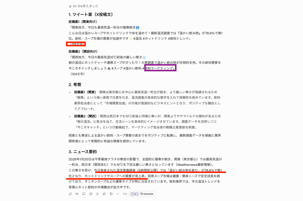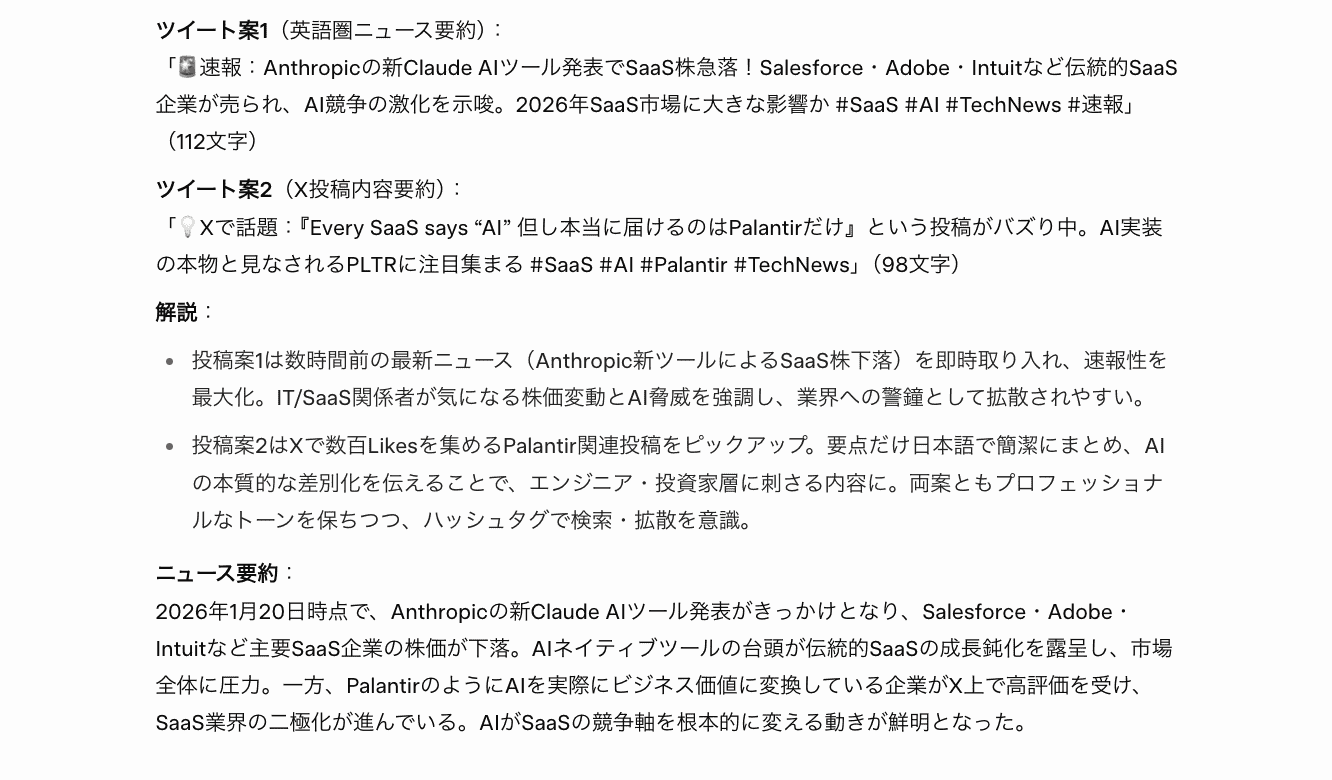 英語圏のニュース50件以上をわずか30秒足らずで解析し、日本語の投稿案にまとめる処理能力には圧倒されるばかり。