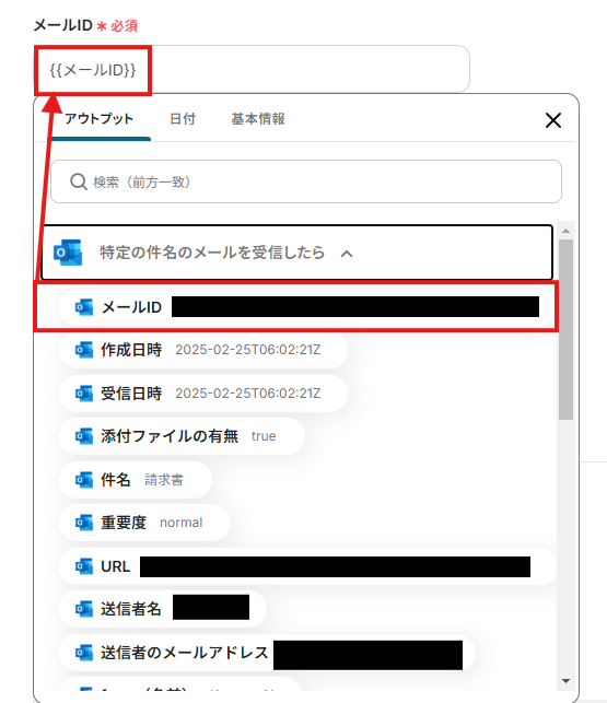 「メールID」は、入力欄をクリックして表示されるアウトプットから選択してください。