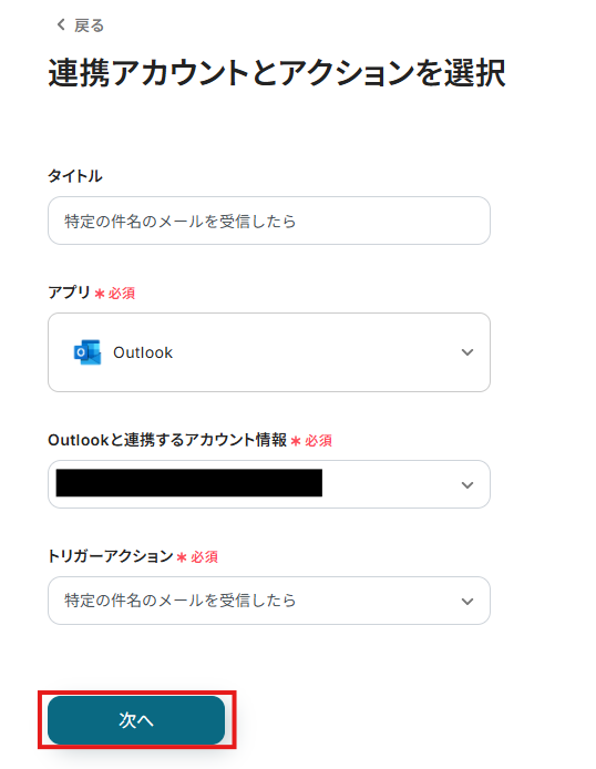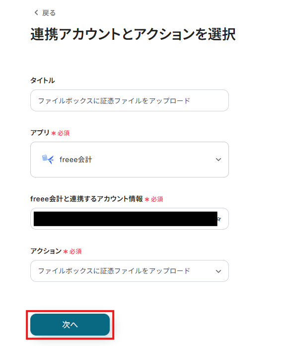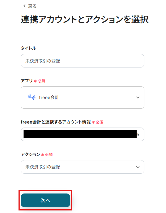表示された画面で必須項目を入力し、「次へ」をクリックします。